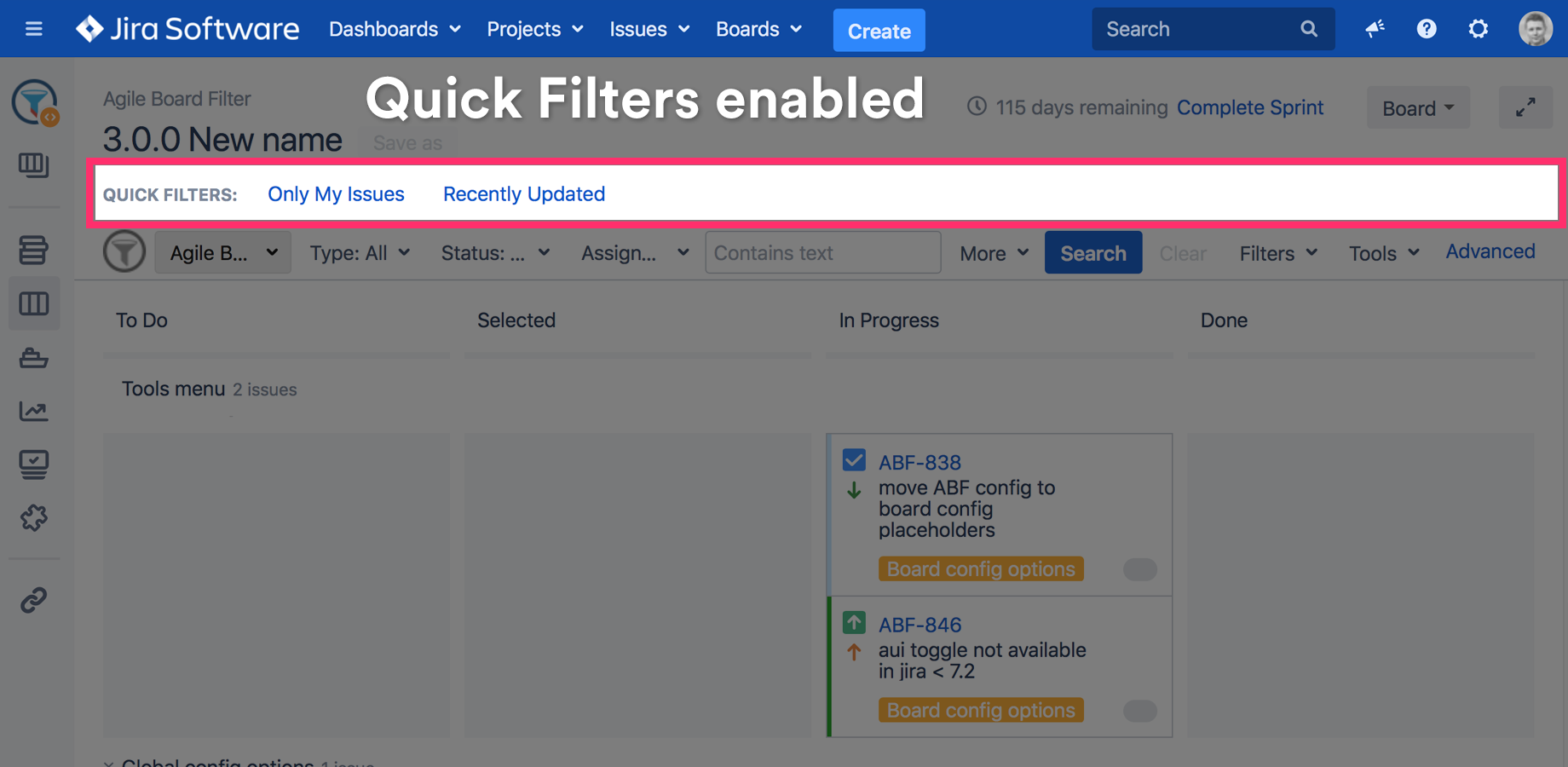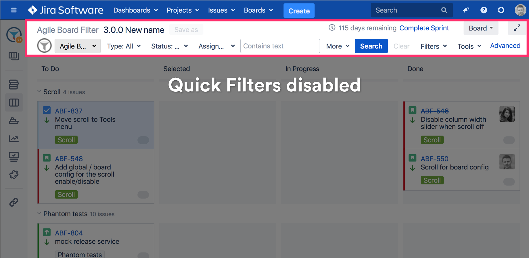 The Agile Tools and Filters configuration allows to disable Quick Filters or the search bar (see Disabling the search bar)