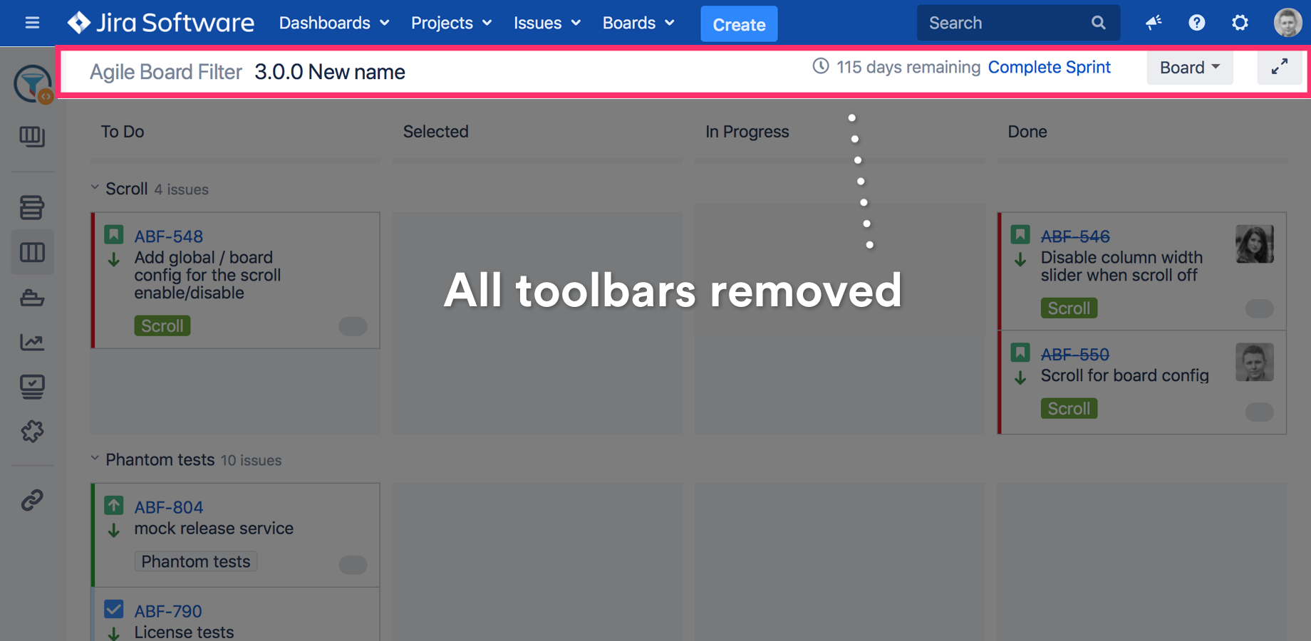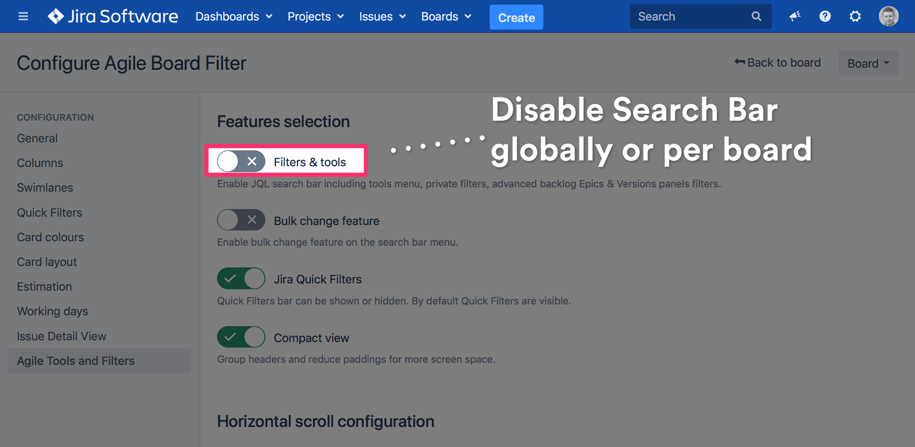 A board administrator can access the Agile Tools & Filters global settings using the system menu and going to the add-ons tab (see Board configuration)