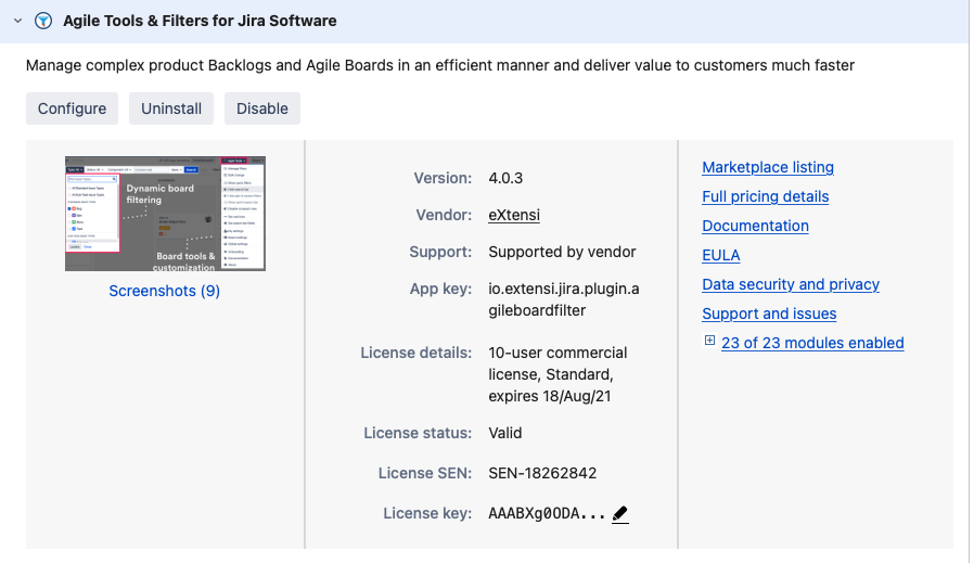 Locate Agile Tools & Filters for Jira Software and expand the information. The Installed Version and License SEN are displayed.