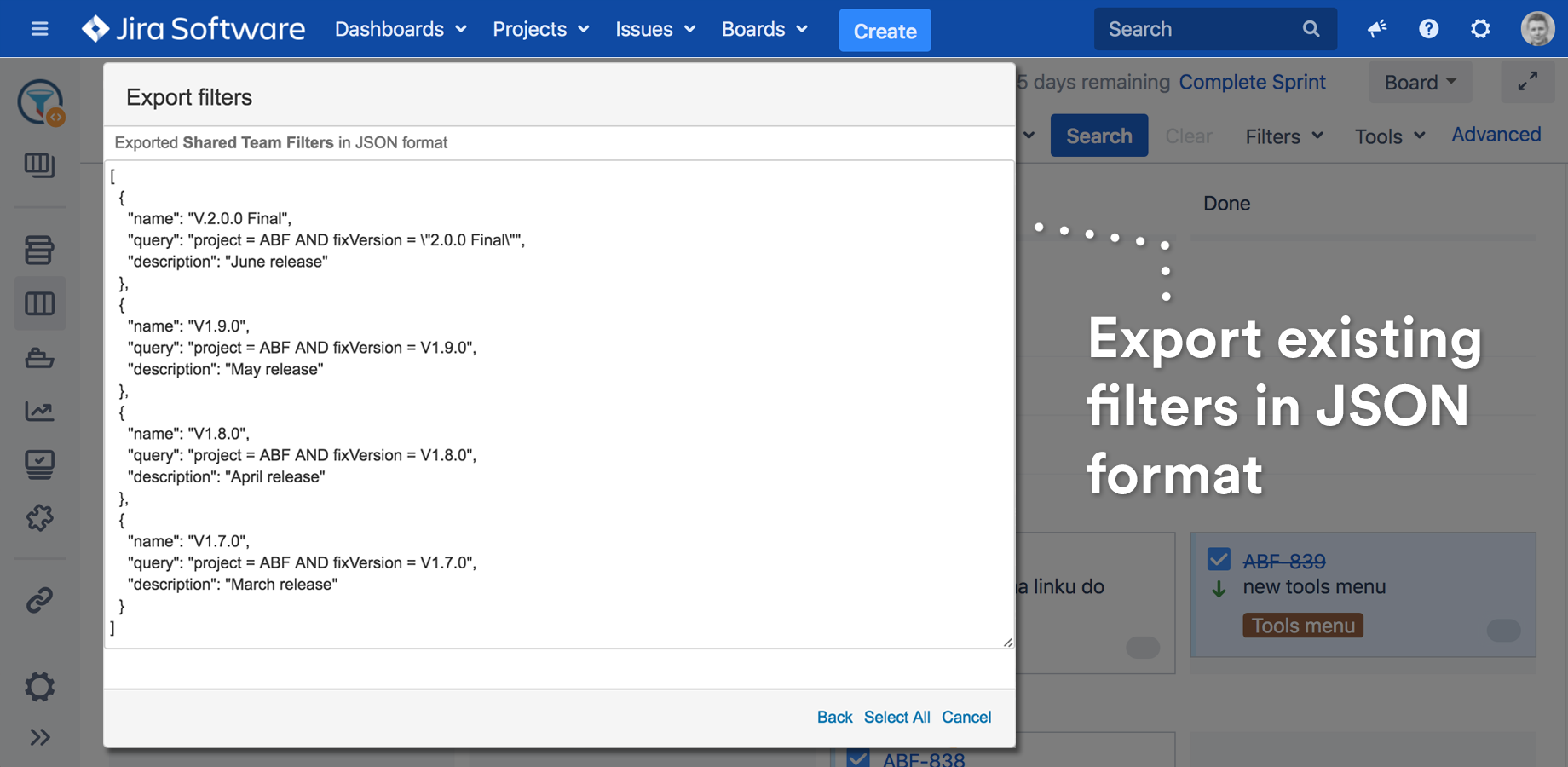 The filters can be exported from the Board Filters, Backlog Filters or Shared Filters Tabs.